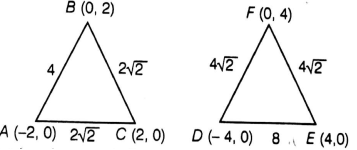 ΔABC with vertices A(0 - 2, 0), B(2, 0) and C(0, 2) is similar to ΔDEF with vertices D( - 4, 0), E(4, 0) and F(0, 4).