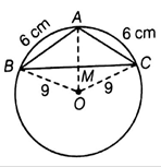 Given : In a circle, ΔABC is inscribed in which AB = AC = 6 cm and radius of circle is 9 cm
