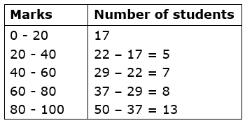 Here, we observe that, 17 students have scored marks below 20 i.e., it lies between class interval 0 - 20 and 22 students have scored marks below 40, so 22 – 17 = 5 students lies in the class interval 20 - 40 continuing in the same manner, we get the complete frequency distribution table for given data.