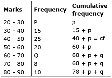 The median of the following data is 50. Find the values of p and q, if the sum of all the frequencies is 90.