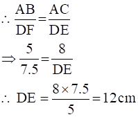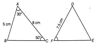 If ∆ABC ∼ ∆DFE, ∠A = 30°, ∠C = 50°, AB = 5 cm, AC = 8 cm and DF = 7.5 cm. Then, which of the following is true?