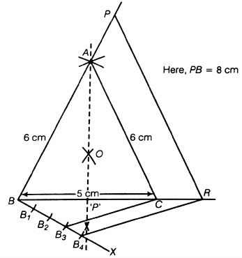 Draw an isosceles triangle ABC in which AB=AC=6 cm and BC=5 cm. Construct a triangle PQR similar to ∆ABC in which PQ=8 cm. Also, justify the construction.