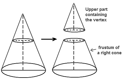 When a cone is divided into two parts by a plane through any point on its axis parallel to its base, the upper and lower parts obtained are cone and a frustum respectively.