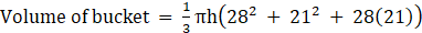 A bucket is in the form of a frustum of a cone and holds 28.490 L of water. The radii of the top and bottom are 28 cm and