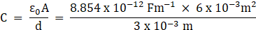 In a parallel plate capacitor with air between the plates, each plate has an area of 6 × 10–3 m2 and the distance between the plates is 3 mm. Calculate the capacitance of the capacitor. If this capacitor is connected to a 100 V supply, what is the charge on each plate of the capacitor?