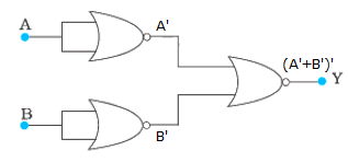 Similar to the circuit (a), the first two gates give inverted output as A’ and B’. The third NOR gate gives the output (A’ + B’)’.