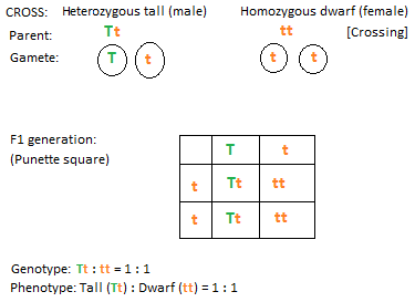 The phenotypic features in the first filial generation after a cross between a homozygous female and a heterozygous male for a single locus, say height, is as follows:
