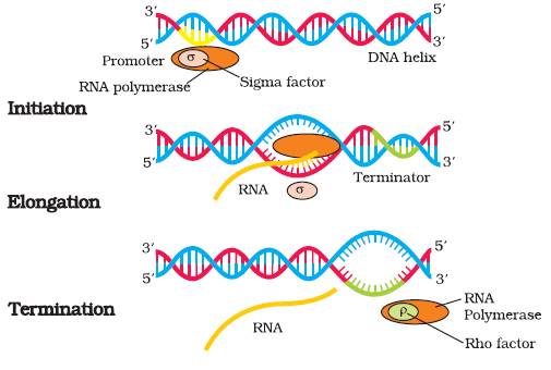 The process of copying genetic information from one strand of DNA into RNA is called transcription. Only a segment of DNA and only one strand is copied into RNA. A transcription unit in DNA contains three regions, a Promoter, the Structural gene, a Terminator. There is single DNA-dependent RNA polymerase that catalyses transcription in bacteria. RNA polymerase binds to promoter and initiates transcription. It also facilitates opening of the helix and continues elongation. Only a short stretch of RNA remains bound to the enzyme. Once the polymerases reaches the terminator region, the RNA falls off and the RNA polymerase. This results in termination of transcription.