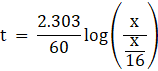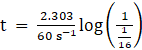 The rate constant for a first order reaction is 60 s–1. How much time will it take to reduce the initial concentration of the reactant to its 1/16th value?