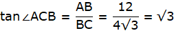 Let AB be the pole and BC be its shadow. Join A and C. Given that, AB = 12m, BC = 4√3m. We get a right-angled triangle ∆ABC, right angled at B. ∠ACB is the angle of elevation of the sun. We will use the trigonometric ratio tan taking AB as the height and BC as the base.