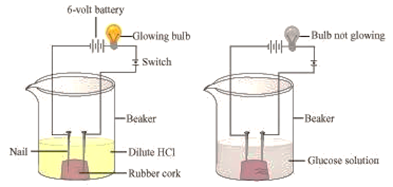 (vi) It will be observed that the bulb glows in HCl solution and does not glow in the glucose solution.
