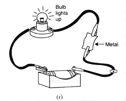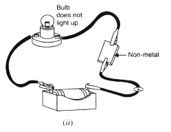 (ii) We can use battery, bulb, wires and switch to set up an electric sample. Now place the given samples to be tested in the circuit between the terminals one by one. The sample which allows the current to pass through it making the bulb to light up, will be a metal. On the other hand, the sample which does not allow the current to pass through it and hence does not make the bulb to light up, will be a non-metal.
