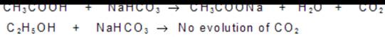 Carboxylic acid reacts with sodium hydrogencarbonate to give brisk effervescence of carbon dioxide gas but alcohol does not react with sodium hydrogen carbonate.