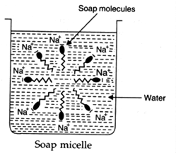 A soap is a sodium or potassium salt of long chain fatty acids. It has one polar end and one non-polar end. Polar end is hydrophilic in nature whereas non-polar end is hydrophobic. When soap is added to water, it forms a colloidal suspension in water in which the soap molecules cluster together to form spherical aggregates called micelles. In a soap micelle, soap molecules are arranged radially with hydrocarbon ends directed towards the center and ionic ends directed outwards.