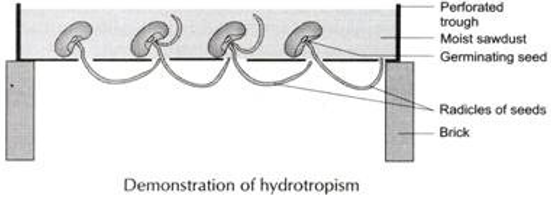 Germinate few seeds in moist dust in ground. After sometime you will observe that radicles start coming out of the ground but they start bending and again enter the moist saw dust. This happens because roots are positively hydrotropic. They bend towards the source of water i.e. moist sawdust in this case.