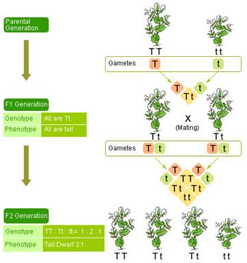 In his experiment with Pea Plant, Mendel crossed pure tall plants (TT) with pure dwarf plants (tt) and he obtained all tall plants in the F1 generation (Tt) which suggested that only one of the traits of parental plant showed in the F1 generation i.e. tall and the other trait- dwarf plants were not obtained.