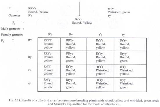 Mendel performed another experiment with Pea plants, this time taking two traits into consideration, yellow round seeds and green wrinkled seeds. He crossed these two plants and in the F1 generation and obtained all yellow round seeds. Yellow and round were dominant so they were expressed and Green and wrinkled were recessive so they remain suppressed. He self-pollinated these F1 generation plants to produce F2 generation and found yellow round seeds, green wrinkled seeds. Also he found yellow wrinkled seeds and green round seeds. Thus this experiment showed that the traits are inherited independently.