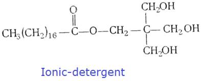 (iii) non-ionic detergents- These do not contain any ion in their constitution. They are the esters of high molecular mass formed by the reaction between polyethylene glycol and stearic acid. Some non-ionic detergents are used as dishwashing detergents.The example of a non-ionic detergent is as follows: