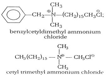 (i) cationic detergents- Cationic detergents are quaternary ammonium salts [chlorides, bromides, acetates, etc.] having long chain alkyl groups. The cationic detergents are more expensive than anionic detergents and hence they find only limited use. However, they possess germicidal properties and are used quite extensively as germicides. The examples of cationic detergents are as follows:
