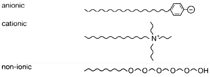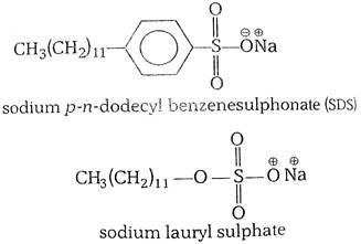 (ii) anionic detergents- A detergent is said to be anionic when the large part of its molecule is an anion and is involved in the cleansing action. The anionic detergents are also effective in slightly acidic solutions. In slightly acidic solutions, they form an alkyl hydrogen sulphate which is a soluble material. In contrast, soaps react with acidic solutions to form insoluble fatty acids.The examples of anionic detergents are as follows: