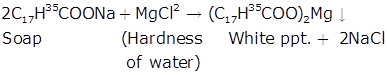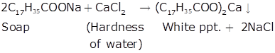 The commonly used soaps are the sodium and potassium salts of higher fatty acids. They are soluble in water and give good lather to it. On the other hand, calcium and magnesium salts of higher fatty acids (calcium and magnesium soaps) are insoluble in water and do not produce lather. Hard water contains Ca2+and Mg2+ ions. When a sodium or potassium soap is added to hard water, it gets converted into an insoluble calcium or magnesium soap as shown ahead.