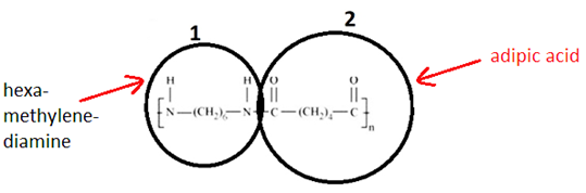 i) Two monomers Hexamethylenediamine [H2N-(CH2)6-NH2] and adipic acid [HOOC-(CH2)4-COOH] combined to form the polymer and a water molecule is removed in this process. Hydrogen(H) is removed from both sides of Hexamethylenediamine and OH group is removed from both sides of adipic acid to give a water molecule.