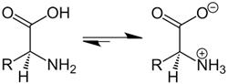 Amino acids are organic compounds containing amine(basic) and carboxyl (acidic) functional group with a specific side chain. Both acidic and basic group are present in the same molecule. In, aqueous solution carboxyl group can lose a proton(H+) and amino group can accept a proton (H+) giving rise to the dipolar ion called as zwitter ion. Zwitter ion is shown below: