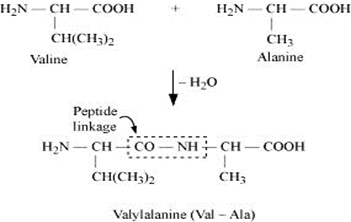 When two molecule of –amino acids similar or different combine in this way that the amino group of one molecule with carboxy group of the other molecule, this result in the elimination of water molecule and the formation of new bond-CO NH- . This type of bond is called peptide bond or peptide linkage. The product of reaction is called dipeptide. For example, COOH group of valine combine with NH2 group of alanine, we get dipeptide Valylalanine (Val-Ala) as final product, as shown below:-