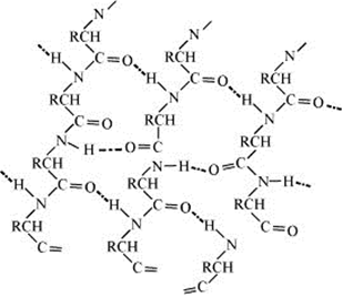 In this conformation, the polypeptide chains lie side by side in a zig0zag manner with alternate R groups on the same side situated at fixed distances apart. The two such neighbouring polypeptide chains are held together by interbounded to form a sheet. These sheets are then stacked one above the other like the pages of the book to form a 3-D structure. This structure resembles pleated folds of drapery and hence is called β–pleated sheet structure. The polypeptide chains can link together in parallel and anti-parallel sequence. Such sheet like structure can easily slip on each other. Proteins of this structure are soft.