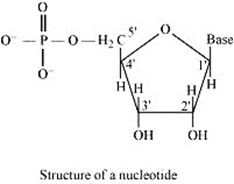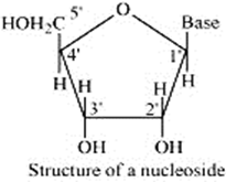 On the other hand , all the three basic components of nucleic acids (i.e., pentose sugar, phosphoric acid and base) are present in a nucleotide.These are obtained by esterification of C5’ –OH group of the pentose sugar by phosphoric acid. Thus, in general, a nucleotide is represented as:-
