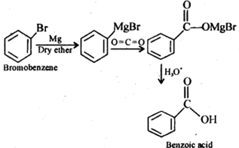 Bromobenzene is first reacted with magnesium in presence of dry ether to give an intermediate which on reaction with solid carbon dioxide followed by hydrolysis leads to the formation of benzoic acid.