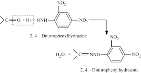aldehydes or ketones react with 2, 4 - dinitrophenylhydrazine to form yellow, orange, or red coloured derivatives named as 2,4 dinitrogenphenylhydrazones. These are also known as 2,4-DNP derivative.