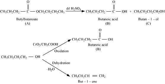 Given compound is having 8 carbons, and on reaction with chromic acid C is converted back into B, as chromic acid reaction couldn’t add any carbon hence both alcohol and acid must contain 4 carbons and it is given in the question that on dehydration C will give but-1-ene so alcohol will be butan-1-ol(C) and acid will be butan-1-oic acid(B) and given reaction will be ester hydrolysis,