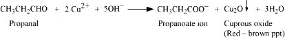 b) fehling test- aldehyde reduces the fehling solution to form red brow precipitate of Cu2O. Fehling's solution is a chemical reagent used to differentiate between water-soluble carbohydrate and ketone functiona groups, and as a test for reducing sugars and non-reducing sugars, supplementary to the Tollens' reagent test.