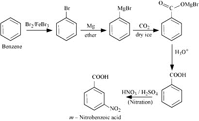 When benzene is treated with Br2 In presence of ferric bromide (brominating agent) they form bromobenzene. When bromobenzene is treated with Mg in ether it will form Grignard reagent, and if the CO2 is treated with Grignard reagent (in acidic condition) it will form benzoic acid. When nitrating mixture is treated with benzoic acid it will form m-Nitrobenzoic acid.