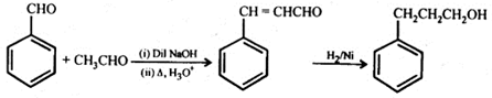 When benzaldehyde is mixed with ethanal in presence of Dil. NaOH and then heating it in acidic condition, and after that hydrogenation it forms 3-phenylpropan-1-ol.