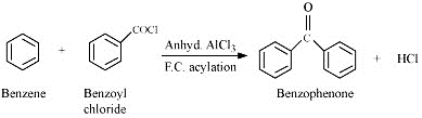 When benzene is mixed with benzoyl chloride in presence of Anhyd.AlCl3 to give benzophenone.