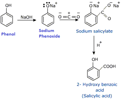 The sodium phenoxide reacts with CO2 under pressure 4-7 atm at a 400K temperature to form sodium salicylate, which on acidification yields salicylic acid. This type of reaction is known as Kolbe’s reaction.