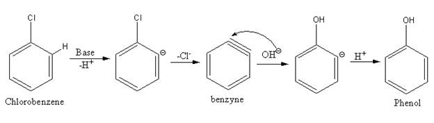 In the next step Cl- leaves, leaving behind the positive charge at that carbon. Both the negative charge and positive charge forms a bond resulting Benzyne as the intermediate.
