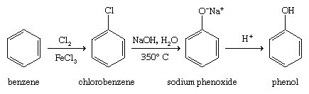 The reaction can start from benzene also. Chlorination of benzene gives Chlorobenzene. When it is further treated with NaOH and H2O at 350°C it results in the formation of sodium phenoxide which on further treatment H+ gives Phenol as the final product.