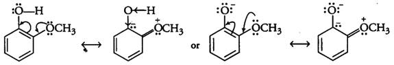 Now, the o-methoxyphenoxide ion left after the loss of a proton is destabilized by resonance. The two negative charges repel each other, thereby destabilizing the o-methoxyphenoxide ion.
