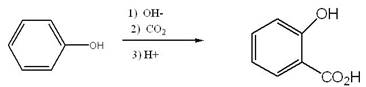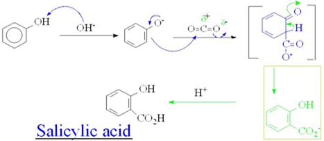 Kolbe’s Reaction: it is a carboxylation chemical reaction that proceeds by heating sodium phenoxide(the sodium salt of phenol)with carbon dioxide under pressure(100 atm,125°C), then treating the product with a sulphuric acid. The final product is salicylic acid (the precursor to aspirin).