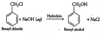 NaOH act as a base in the conversion of benzyl chloride to benzyl alcohol. On hydrolysis removal of NaCl takes place and OH is inserted in place of Cl.