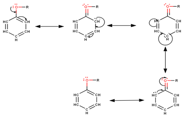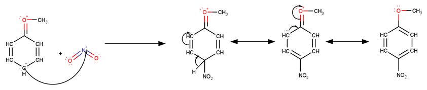 As seen from the resonating structures above the structure in which the negative charge is in the para position will form a more stable product when attacked by an electrophile. Hence in the following reactions, we will be considering that resonating structure as the starting material.