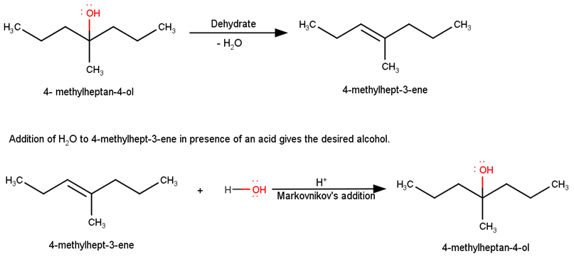 We know that the addition and elimination reactions are opposite of each other.Hence, for solving the above questions our approach should be to first dehydrate a suitable alcohol to give either a single alkene or a mixture of an alkene, if we obtain a mixture of alkene then we would have to detect which of the alkene will give us the desired alcohol. Wherever required the acid-catalyzed addition of water to alkenes will follow Markovnikov’s rule.