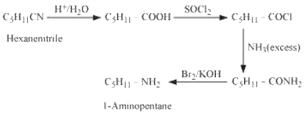 Explanation: The structure of Hexanenitrile is CH3CH2CH2CH2CH2CN or C5H11CN. To convert Hexanenitrile into 1-aminopentane, first we need hexanamide (amide group-RCONH2) and we can get hexanamide from hexanoyl chloride (acid chloride group – RCOCl) and we can get hexanoyl chloride from hexanoic acid.