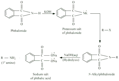 This is a very convenient method for the preparation of pure aliphatic primary amines. Phthalimide on treatment with ethanolic KOH gives potassium phthalimide which on heating with a suitable alkyl halides gives an N- substituted phthalimides followed by the subsequent hydrolysis to give corresponding primary amines.