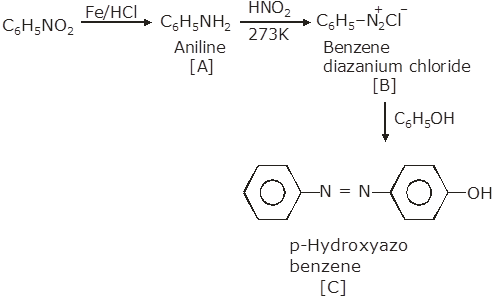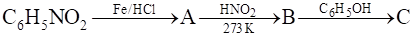 Nitrobenzene upon reduction with iron/acid mixture gives A, followed by oxidation with nitrous acid gives B and reacting with phenol undergoes addition reaction to give C.