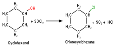 Cyclohexanol will react with thionyl chloride to form Chlorocyclohexane with the evolution of sulphur dioxide and hydrogen chloride gas as shown below : -