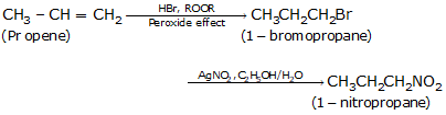 Propene on treatment with HBr in the presence of peroxide (anti-markovnikoff’s rule which states the negative part i.e. Br- goes to the carbon which has more number of hydrogens and positive part i.e. H+ goes to the carbon which has lesser number of hydrogens) gives 1-bromopropane which on treatment with silver nitrite in the presence of alcohol or water gives 1-nitropropane as the final product.